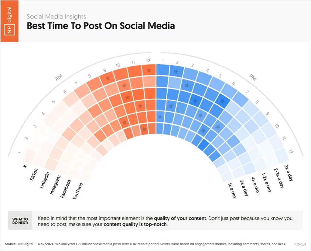 Graficele sale includ și orele optime de publicare, iar recomandările sunt susținute de date solide din analize globale.